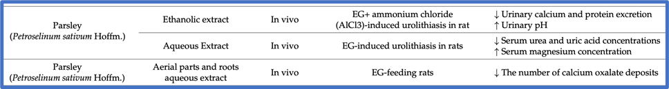 [17] Saeidi, J.; et. al. Therapeutic effects of aqueous extracts of Petroselinum sativum on ethylene glycol-induced kidney calculi in rats. Urol. J. 2012, 9, 361–366.