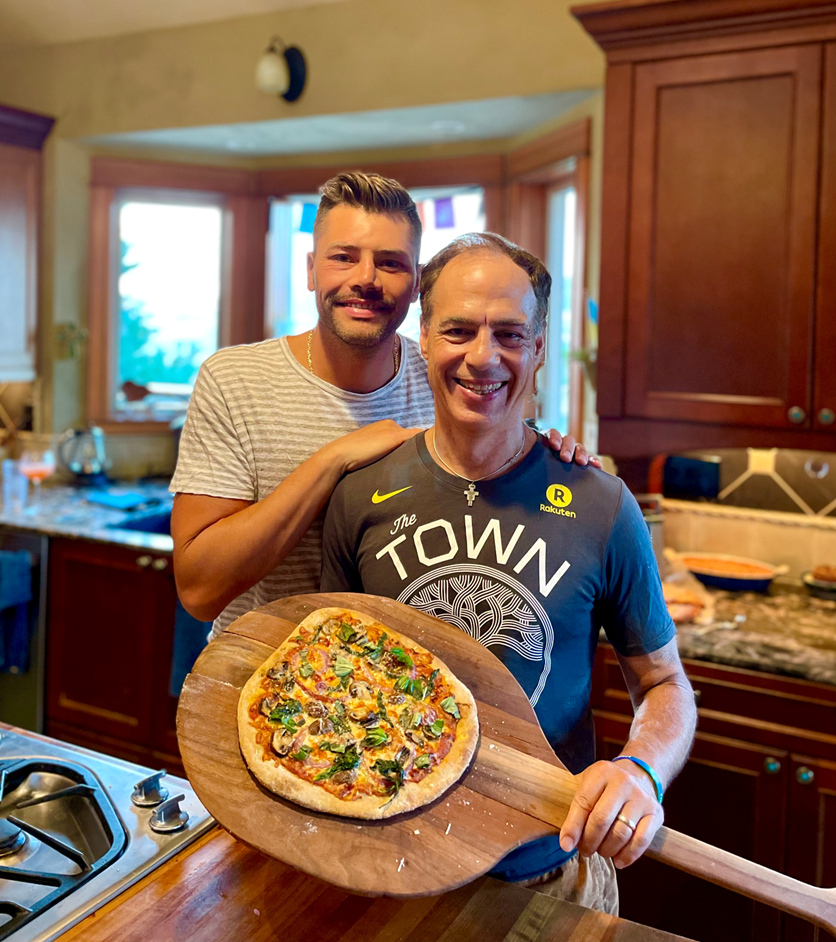 Donnie Yance in his Golden State Warriors shirt with his cousin Emil making homemade whole-grain pizza—yum!