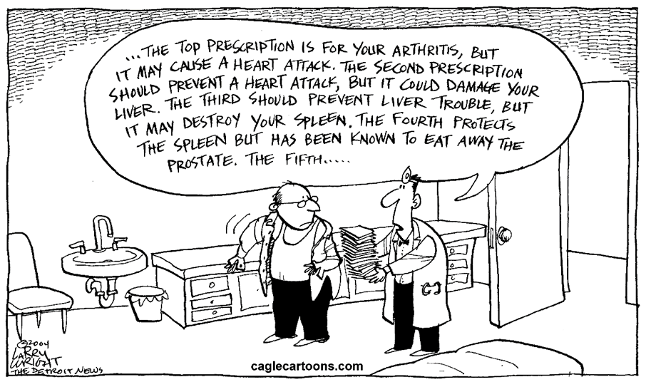 This is a true story, reported in the Washington Post, about a woman who was in the hospital for a severe asthma attack. In the hospital she was prescribed steroids for the asthma, which made her blood pressure too high and caused vertigo. So, the hospital prescribed a blood pressure medication, which made her dizzy. Then her ankles began to swell, so she was given a water pill, which in turn caused her potassium levels to bottom out. So then the doctors added potassium supplements. To top it all off she was given a drug to treat osteoporosis, which eventually lead to gastric bleeding. Prescribed multiple medications, this poor patient, an 83-year-old grandmother, told the reporter, “I came out sicker than I went in.”