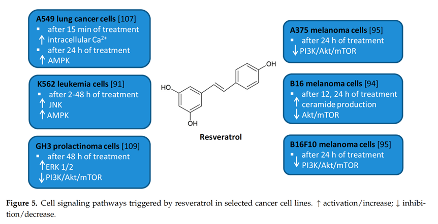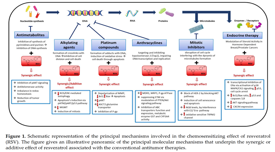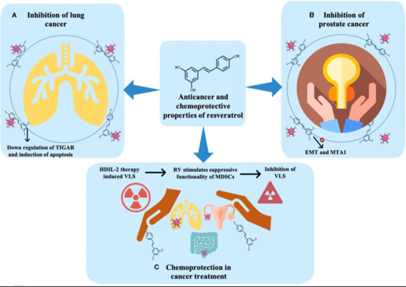Resveratrol has been proven in numerous studies to have anticancer and chemoprotective effects, as shown in the illustration below.