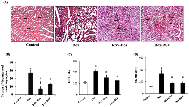 Both prophylactic and therapeutic use of resveratrol mitigates DOX induced deterioration of cardiac function as assessed by echocardiography. Also, resveratrol treatment (prophylactic and therapeutic) prevented DOX-induced myocardial damage as measured by cardiac enzymes (LDH and CK-MB) in serum. This was associated with decrease in DOX induced myocardial apoptosis and fibrosis. This study reveals that prophylactic use of RSV was more effective than its therapeutic use in mitigating DOX induced apoptosis and fibrosis in the myocardium. Therefore, prophylactic use of resveratrol should be considered as a possible future adjuvant therapy to minimize cardiotoxic side effects of doxorubicin in cancer patients.