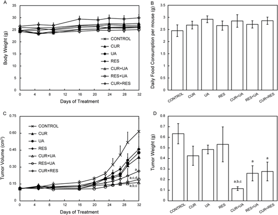 In vivo effect on HMVP2 tumor growth of treatment with CUR, UA, RES and their combinations. HMVP2 cell spheroids were injected subcutaneously into the flank of male FVB/N mice. Mice were fed ad libitum with semi-purified AIN76A-based diet containing CUR, UA, RES or their combinations of two natural compounds. Body weight (a), food consumption (b), tumor volume (c) and tumor weight (d) are shown as mean ± SEM. One-way ANOVA with significance at p < 0.05 was used. Statistical significance is shown as different from control (a), CUR (b), UA (c) and RES (d)[48]