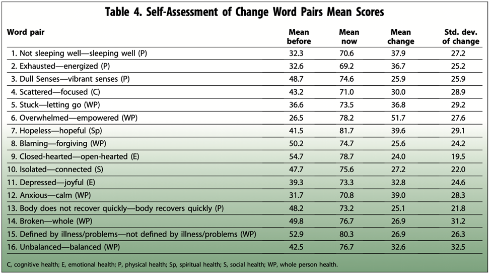 Baseline assessments revealed that respondents came into the study experiencing a variety of difficult symptoms, the most pronounced of which were cognitive challenges (anxiety, depression, fear, foggy thinking, memory loss, and uncertainty). Patients also expressed concerns over wound healing, as well as pain, digestive issues, low energy, fatigue, exhaustion, and insomnia.