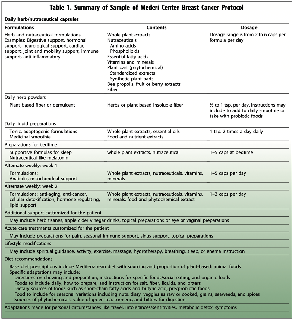 The Mederi Care protocol used for this study included a variety of integrative healing interventions, such as specific herbal tonics customized to each patient, diet recommendations and coaching, and herbal supplements. Patients also were prescribed lifestyle modifications, including exercise, massage, hydrotherapy, breathing suggestions, enema instructions, sleep hygiene, stress support, and spiritual guidance.