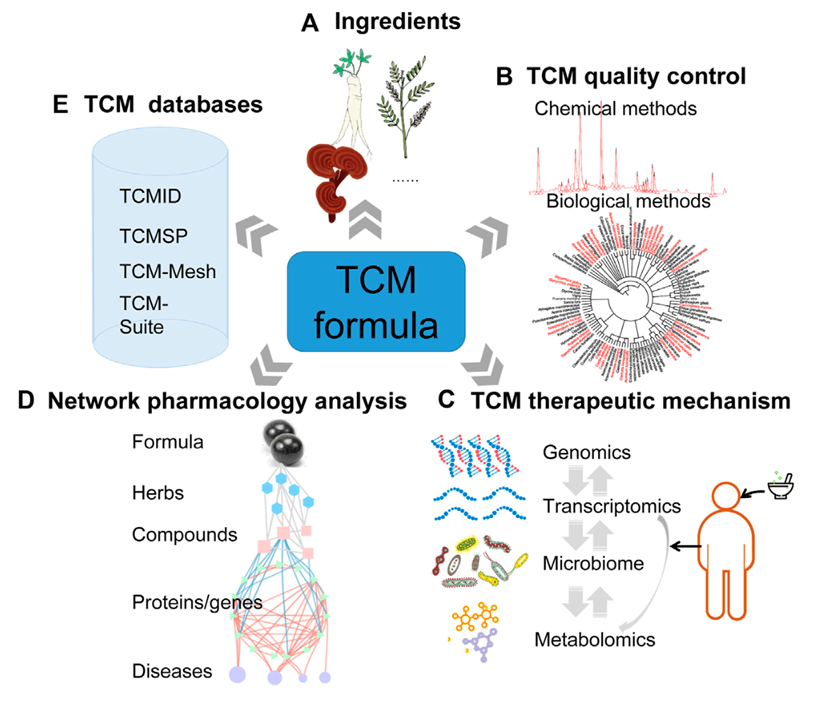 (A) Prescribed ingredients of TCM formula recorded in Chinese Pharmacopoeia (2020 edition). (B) The TCM quality control (fingerprint-based chemical ingredients analysis methods and genomics-related biological ingredients analysis methods). (C) Multi-omics approaches, including genomics, transcriptomics, microbiome, and metabolomics, could be utilized for investigating the therapeutic mechanism of the TCM formula for treating various diseases. (D) Network pharmacology analysis for screening the bioactive compounds and potential targets for TCM formulas in treating various diseases. (E) The databases for TCM research. The current databases serve as a link across TCM formulas, ingredients, bioactive compounds, targets (proteins/genes), and various diseases.[2]