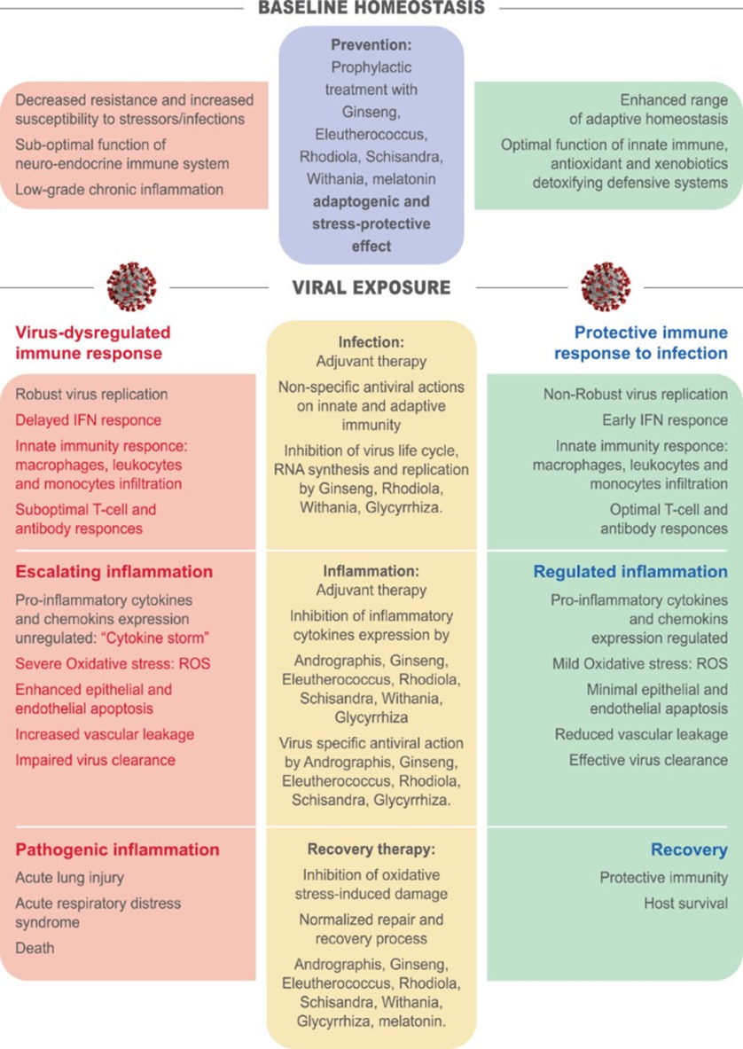 Adopting a phased immunophysiological approach to viral infection, adaptogens exert multitarget effects on the neuroendocrine-immune system by triggering adaptive stress responses, and have a place in prevention, infection, escalating inflammation and recovery.[18]