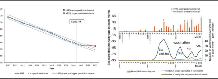 Age-adjusted mortality rates (AMRs) over time and excess mortality in each month: all cancers.