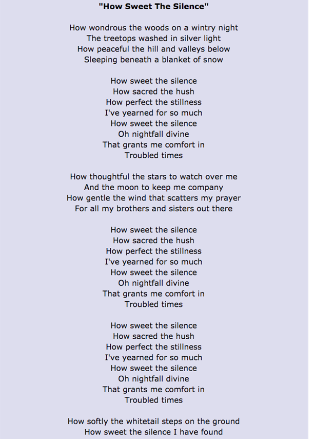 When I am silent, I hear my true self and access the depths of my soul. When I am silent, I hear with a caring heart. Silence teaches us to know reality by respecting it where words have defiled it. In silent reflection, I am able to abandon myself to the will of the Divine One. If our life is poured out in useless words, we will never hear anything because we have said everything before we had anything meaningful to say.